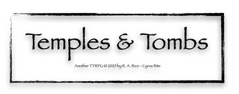 Temples and Tombs is a simple roleplaying game designed for solo or group play. The goal of the game is to gain fame and fortune by exploring and looting the lost Temples and Tombs hidden away by time and nature.
